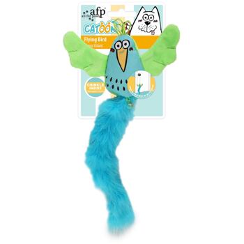 The cute bird is made of fabric and plush and is stuffed with crunchy material. The cat's senses will be teased by its unmissable long tail made of blue feathers with a bell.