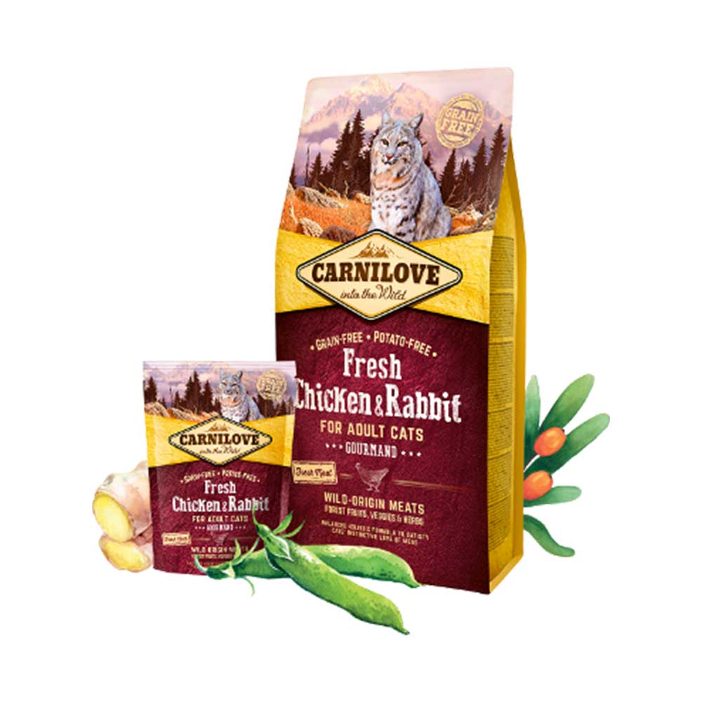Unique and independent creatures, cats are meat eaters, full-blooded predators whoseway of life is determined by a strong hunting instinct. Carnilove Fresh Chicken & Rabbit has been formulated with respect for the laws of nature and provides your feline companion with balanced nutrition rich in fresh meat combined with a variety of vegetables, berries and herbs. Returning to a natural diet supports healthy digestion and helps maintain optimal physical condition. Bursting with flavor, the top-quality natural ingredients are irresistible to even the choosiest of feline gourmands.