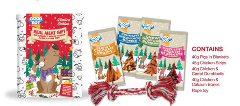 Give your dog the gift of a truly pawsome Christmas with the Good Boy Real Meat Gift Tin. Order yours today and watch your dog's tail wag with excitement.