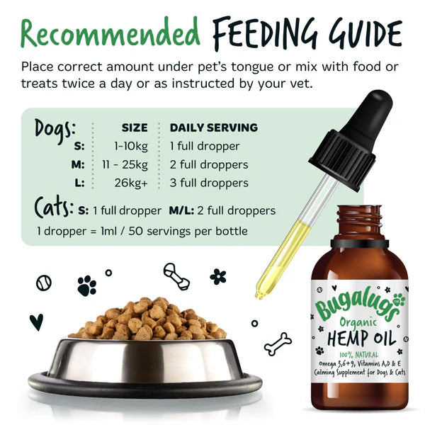 Bugalugs Organic Hemp Seed Oil is a 100% natural supplement enriched with omega 3 for dogs, 6, 9 and Vitamins A, D & E. Designed to keep anxious pets calm during stressful situations, whilst maintaining immune systems and promoting healthy joint and hip function.