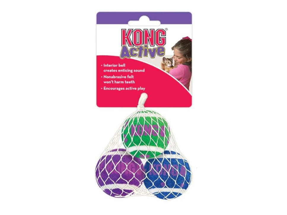 KONG Active cat toys promote healthy exercise and fulfill cats' instinctual desires to chase, hunt and capture. Why let dogs have all the fun? KONG Cat Tennis Balls boast nonabrasive felt and won't harm teeth during play. Cats won't be able to resist interior bell, encouraging exercise in indoor cats.