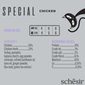 A recipe specifically formulated for cats with a tendency to be overweight, with a lower calorie count than the other Schesir mousses for adult cats; based on real chicken meat, with the addition of turkey blended, into a soft and velvety mousse.